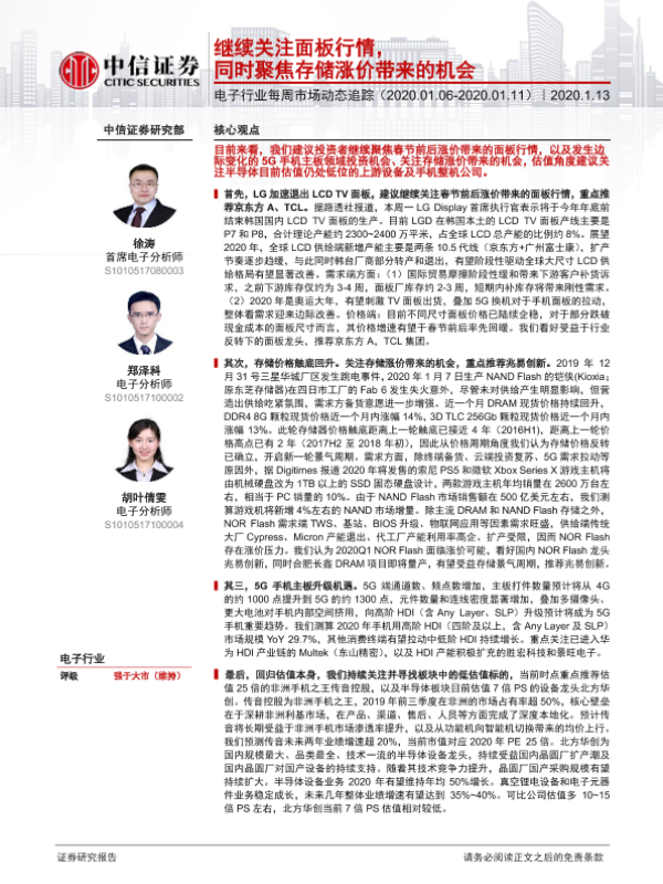 【中信证券】【20200113】电子行业每周市场动态追踪:继续关注面板行情,同时聚焦存储涨价带来的机会-21页 行业研究