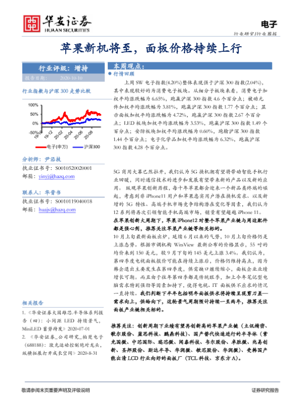 【华安证券】【20201010】20201010-华安证券-电子行业周报:苹果新机将至,面板价格持续上行-17页 行业研究