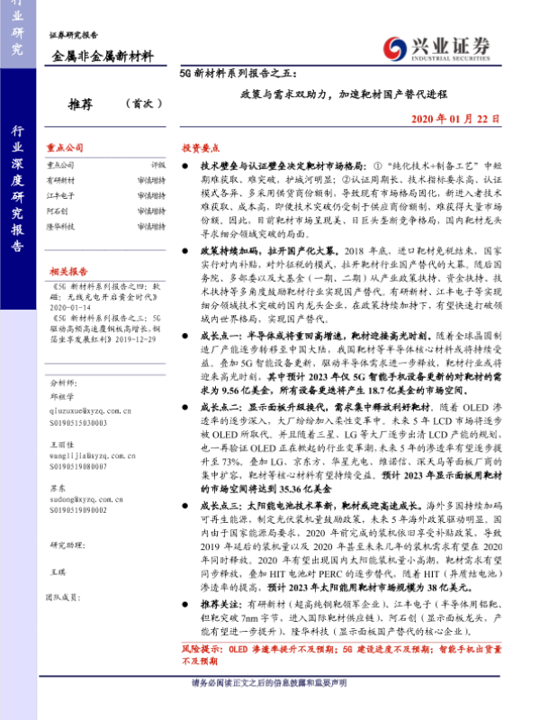 【兴业证券】【20200122】5G新材料系列报告之五:政策与需求双助力,加速靶材国产替代进程-33页 行业研究