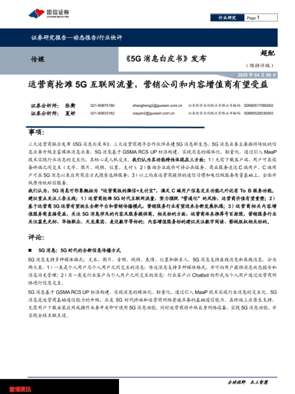 【国信证券】【20200409】20200409-国信证券-传媒行业快评:《5G消息白皮书》发布-运营商抢滩5G互联网流量,营销公司和内容增值商有望受益-6页 行业研究