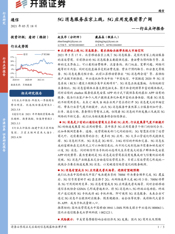 【开源证券】【20210518】20210518-开源证券-通信行业点评报告:5G消息服务在京上线,5G应用发展前景广阔-3页 行业研究
