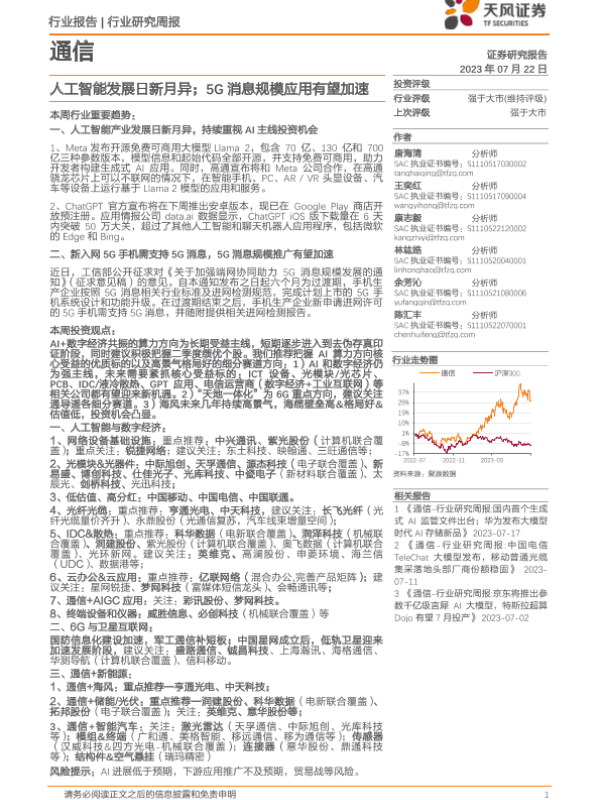 【天风证券】【20230722】20230722-天风证券-通信行业研究周报:人工智能发展日新月异;5G消息规模应用有望加速-12页 行业研究