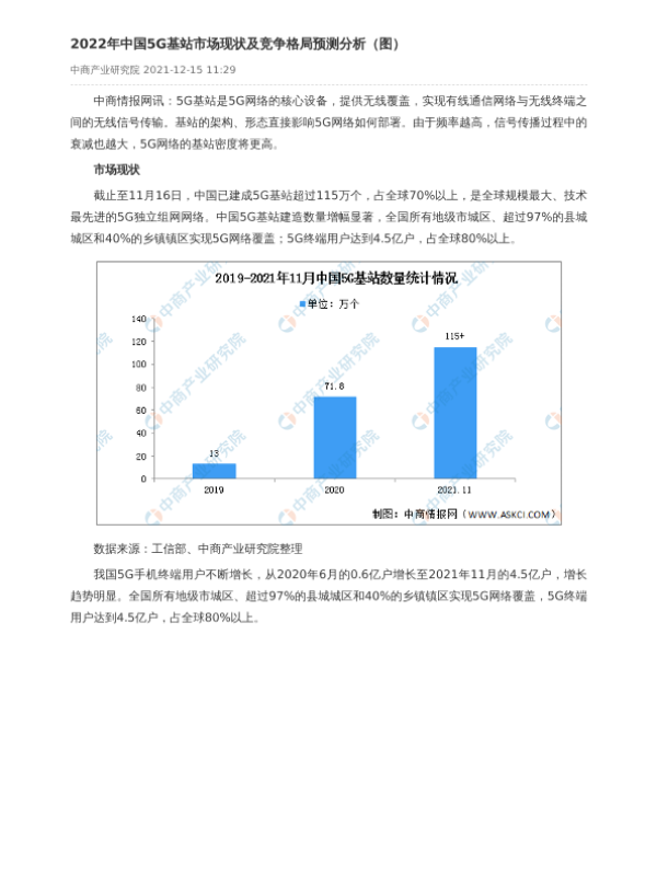 【中商产业研究院】【2022】2022年中国5G基站市场现状及竞争格局预测分析-2页 行业研究