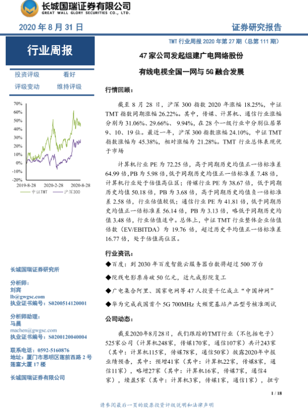 【长城国瑞证券】【20200831】TMT行业周报2020年第27期(总第111期):47家公司发起组建广电网络股份 有线电视全国一网与5G融合发展-18页 行业研究