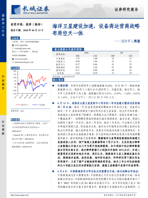 【长城证券】【20200615】20200615-长城证券-国防军工周报:海洋卫星建设加速,设备商运营商战略布局空天一体-20页 行业研究