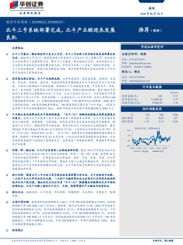 【华创证券】【20200628】通信行业周报:北斗三号系统部署完成,北斗产业链迎来发展良机-19页 行业研究