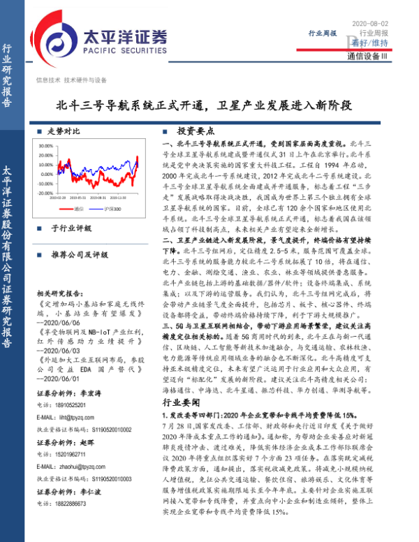 【太平洋证券】【20200802】通信设备Ⅲ行业周报:北斗三号导航系统正式开通,卫星产业发展进入新阶段-14页 行业研究