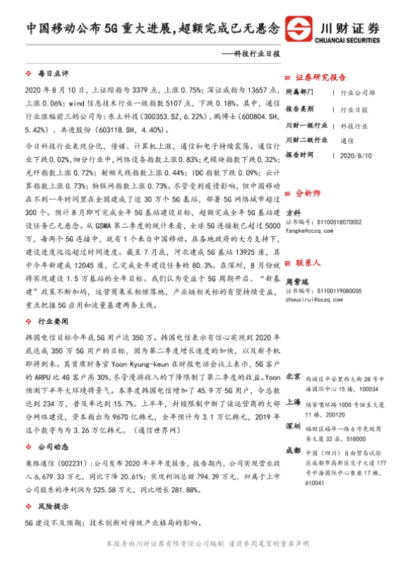 【川财证券】【20200810】中国移动公布5G重大进展,超额完成已无悬念-4页 行业研究