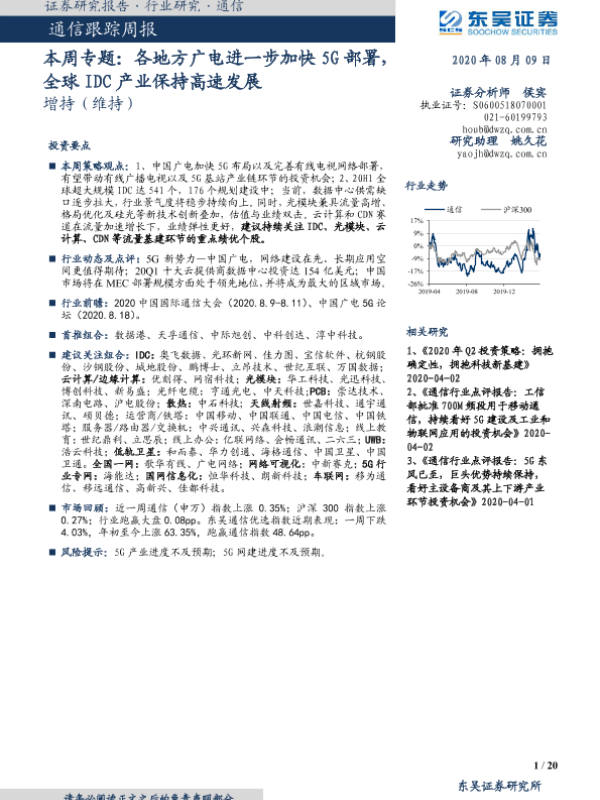 【东吴证券】【20200809】2020年08月09日更新-各地方广电进一步加快5G部署,全球IDC产业保持高速发展-20页 行业研究