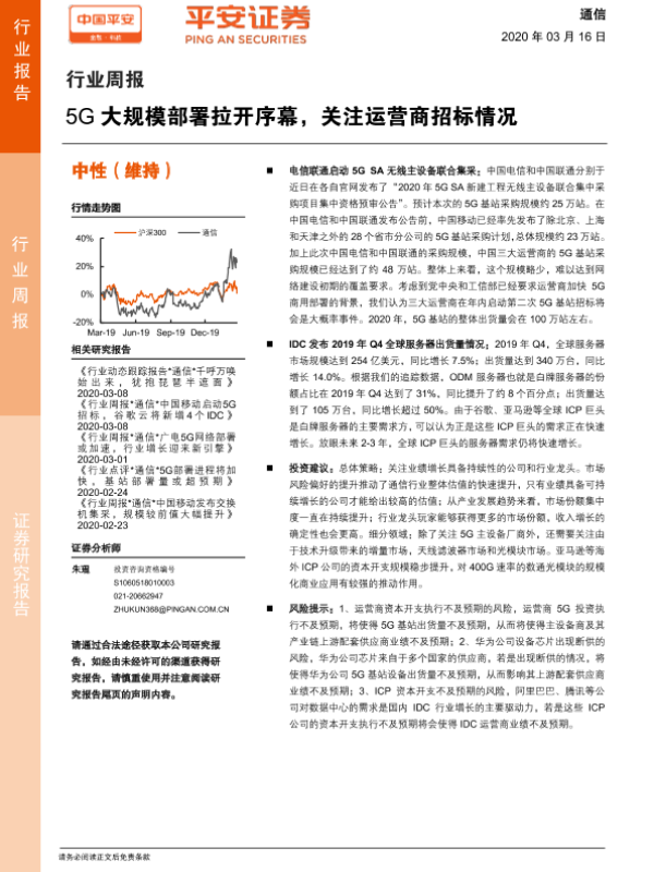 【平安证券】【20200316】通信行业周报:5G大规模部署拉开序幕,关注运营商招标情况-5页 行业研究