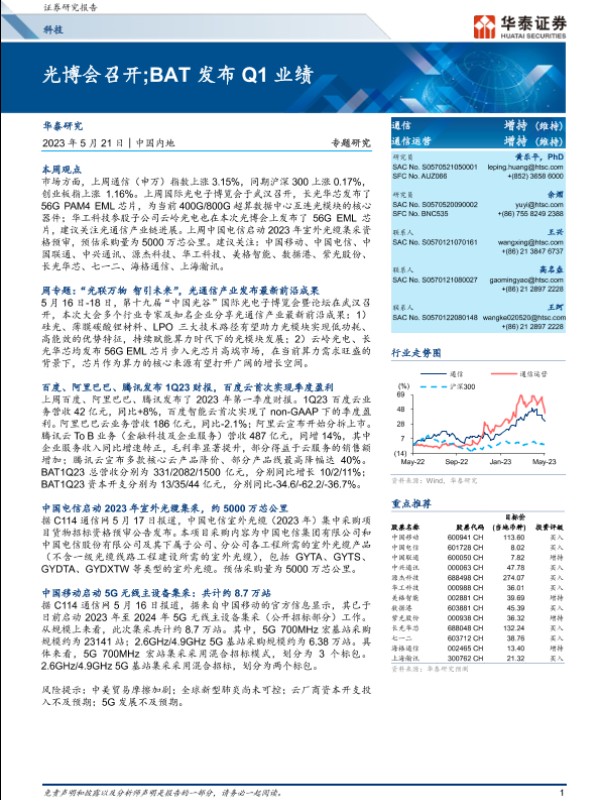 【华泰证券】【20230521】通信行业专题研究:光博会召开;BAT发布Q1业绩-24页 行业研究