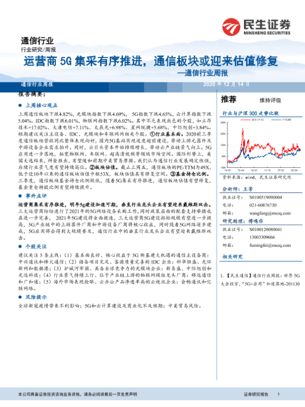 【民生证券】【20201214】通信行业周报:运营商5G集采有序推进,通信板块或迎来估值修复-16页 行业研究