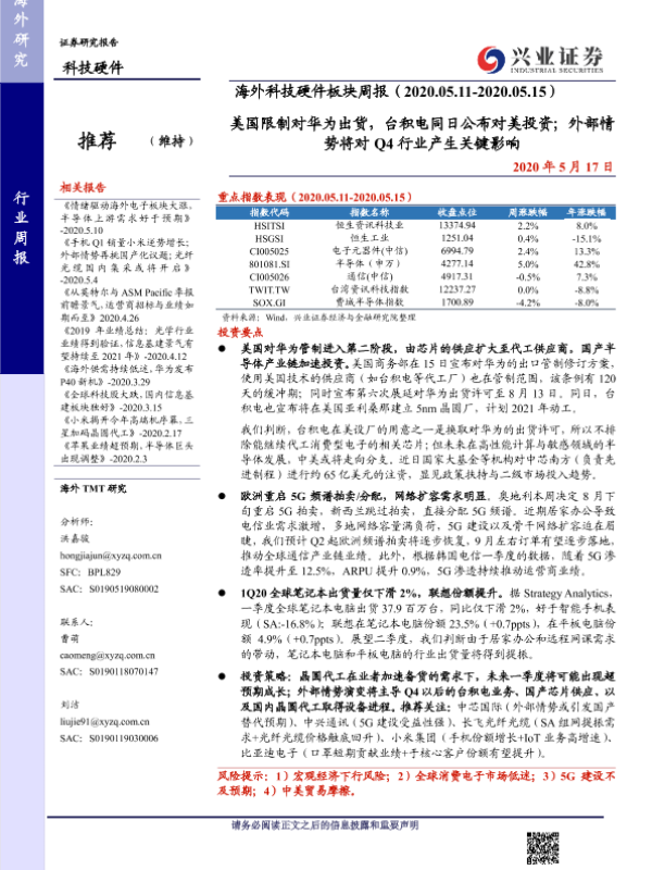 【兴业证券】【20200517】20200517-兴业证券-海外科技硬件板块周报:美国限制对华为出货,台积电同日公布对美投资;外部情势将对Q4行业产生关键影响-19页 行业研究