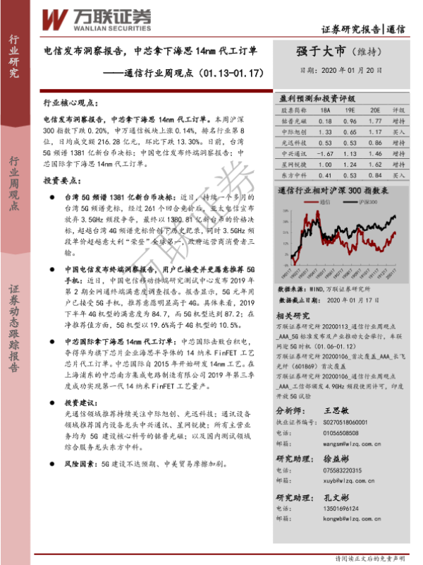 【万联证券】【20200120】20200120-万联证券-通信行业周观点:电信发布洞察报告,中芯拿下海思14nm代工订单-12页 行业研究