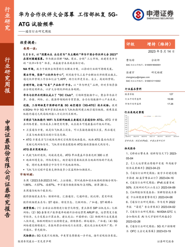 【申港证券】【20230514】通信行业研究周报:华为合作伙伴大会落幕 工信部批复5G-ATG试验频率-13页 行业研究