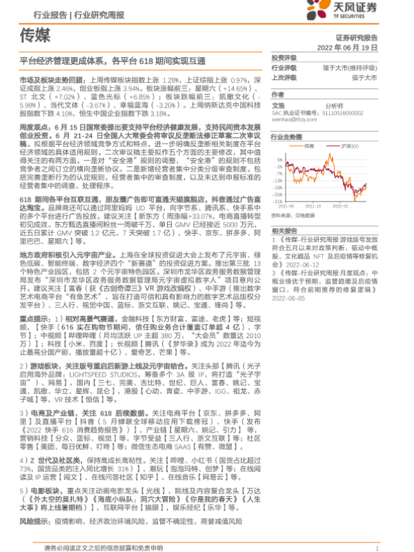【天风证券】【20220619】传媒行业研究周报:平台经济管理更成体系,各平台618期间实现互通-14页 行业研究