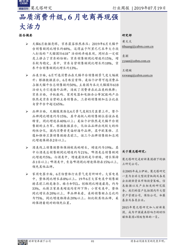 【莫尼塔研究】【20190719】消费行业数据周报:品质消费升级6月电商再现强大活力-7页 行业研究