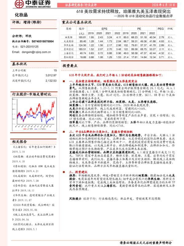 【中泰证券】【20200610】618美妆需求持续释放,珀莱雅丸美玉泽表现突出-7页 行业研究
