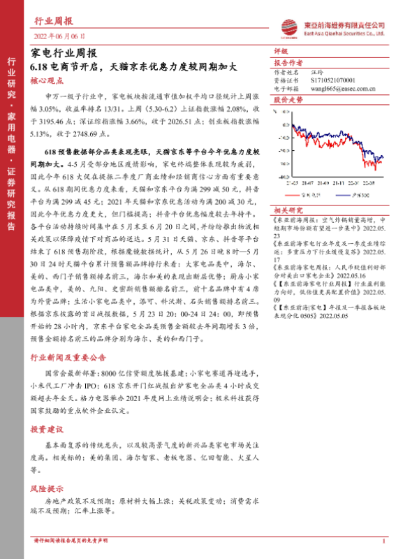 【东亚前海证券】【20220606】20220606-东亚前海证券-家电行业周报:6.18电商节开启,天猫京东优惠力度较同期加大-19页 行业研究