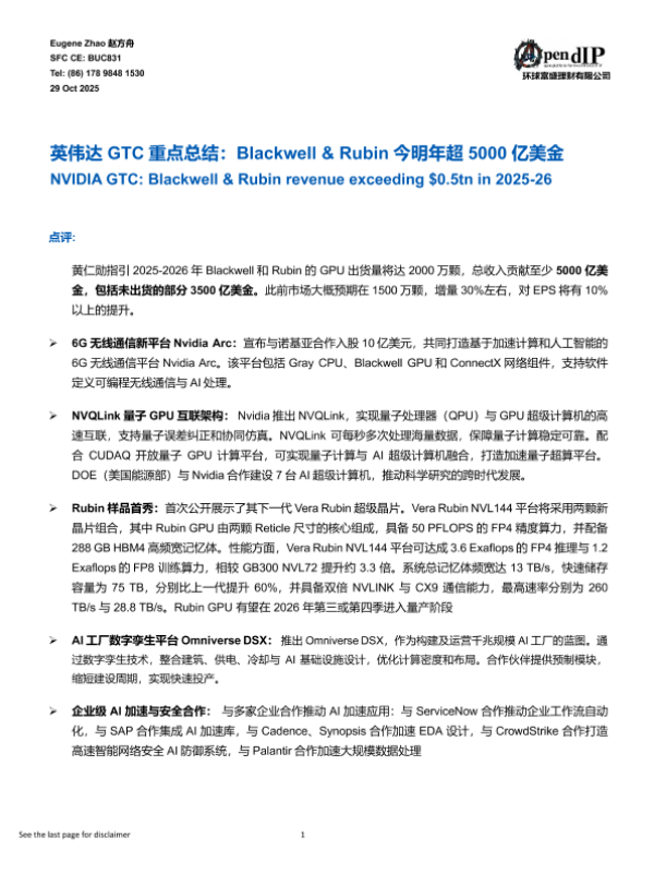 【环球富盛理财有限公司】【202510】英伟达GTC重点总结:Blackwell& Rubin今明年超 5000亿美金-6页 证券期货研究报告