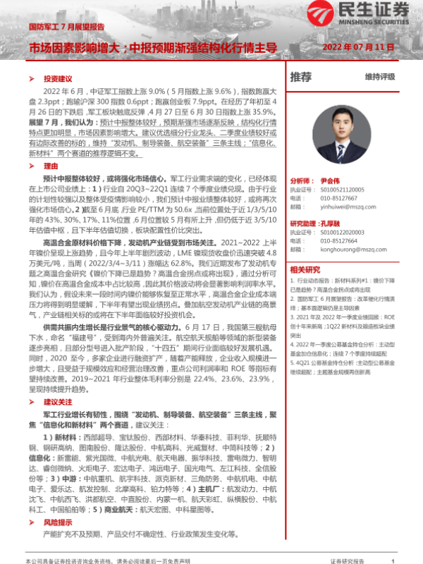 【民生证券】【20220711】国防军工行业7月展望报告:市场因素影响增大;中报预期渐强结构化行情主导-15页 行业研究