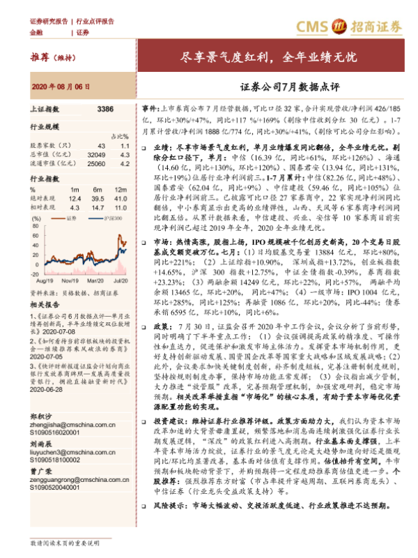 【海通证券】【20200806】证券公司7月数据点评:尽享景气度红利,全年业绩无忧-4页 行业研究