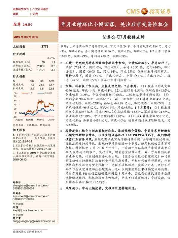 【海通证券】【20190806】证券公司7月数据点评:单月业绩环比小幅回落,关注后市交易性机会-4页 行业研究