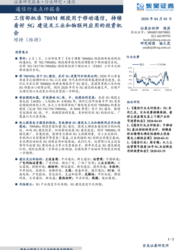 【东吴证券】【20200401】通信行业点评报告:工信部批准700M频段用于移动通信,持续看好5G建设及工业和物联网应用的投资机会-2页 行业研究