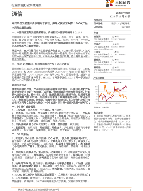 【天风证券】【20201213】通信行业研究周报:中国电信光缆集采价格略好于移动,数通光模块龙头推出800G产品-14页 行业研究