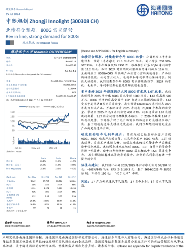 【海通国际】【20240715】中际旭创(300308)业绩符合预期,800G需求强劲-13页 行业研究