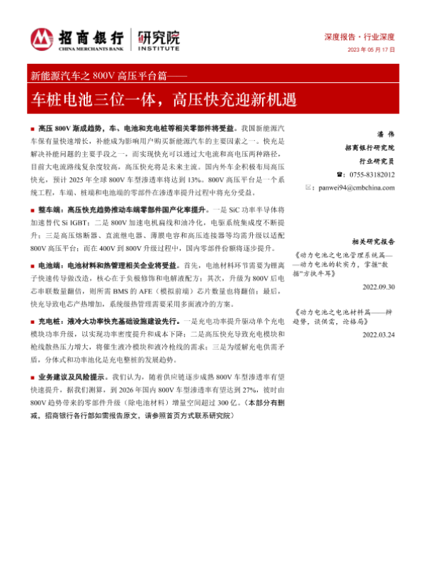 【招商银行】【20230517】新能源汽车之800V高压平台篇——车桩电池三位一体,高压快充迎新机遇-36页 行业研究