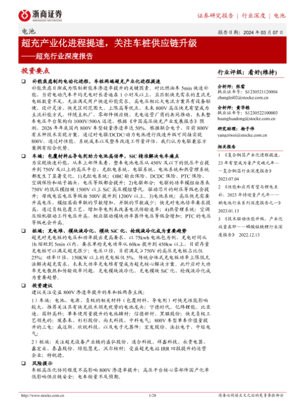 【浙商证券】【20240307】电池超充行业深度报告:超充产业化进程提速,关注车桩供应链升级-28页 行业研究