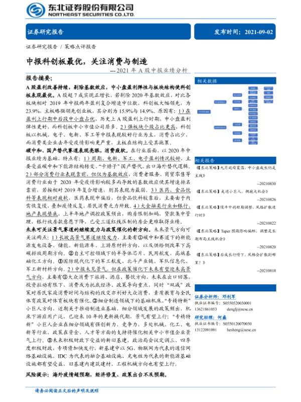 【东北证券】【20210902】2021年A股中报业绩分析:中报科创板最优,关注消费与制造-20页 行业研究