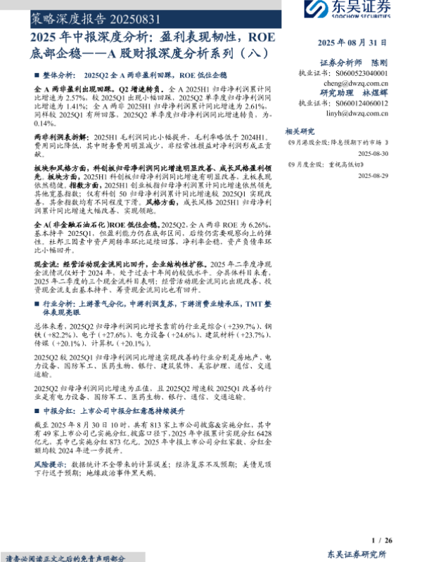 【东吴证券】【202508】2025年中报深度分析:盈利表现韧性,ROE底部企稳-26页 证券期货研究报告