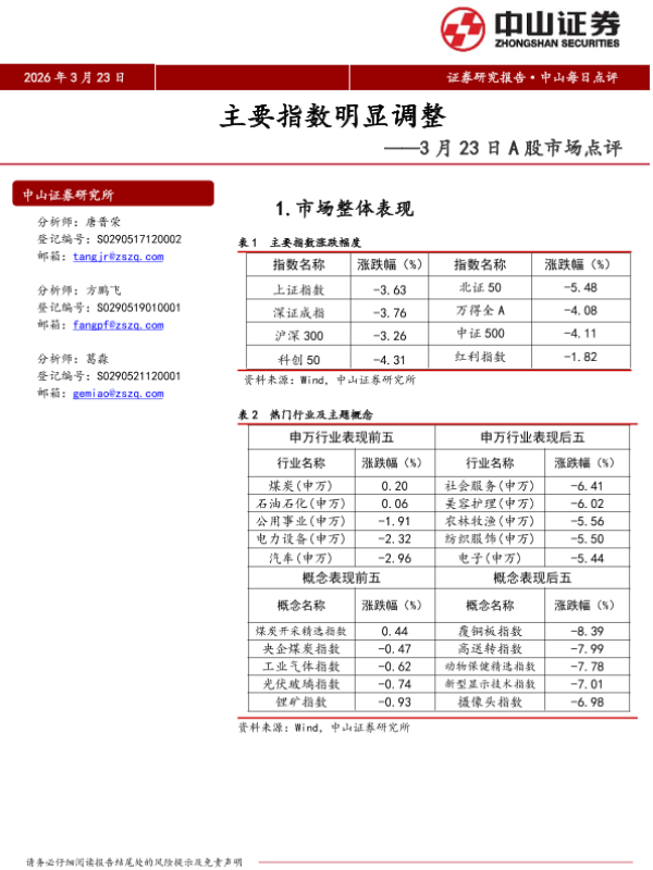 【中山证券】【202603】2026年 3月 23日 证券研究报告·中山每日点评 主要指数明显调整——3月 23日 A股市场点评-5页 证券期货研究报告