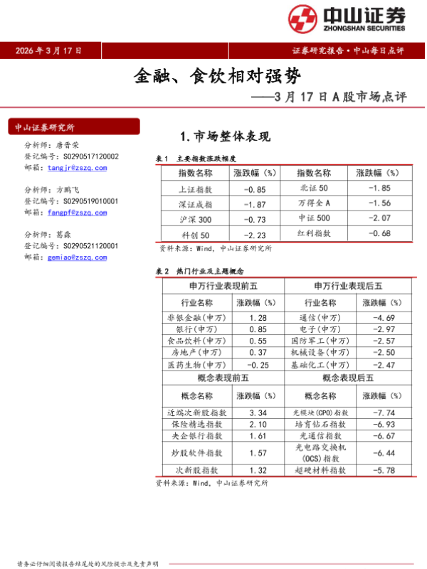 【中山证券】【202603】金融、食饮相对强势——3月17日A股市场点评-5页 证券期货研究报告