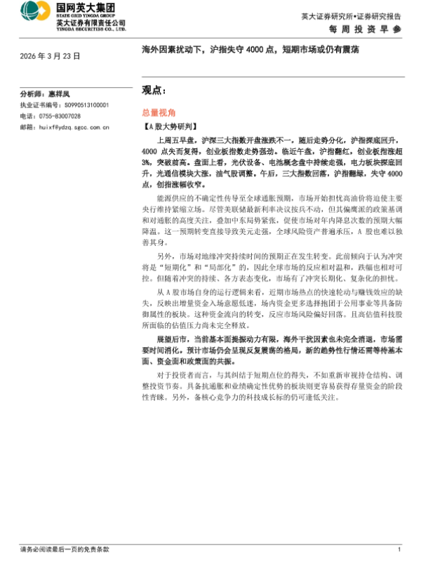 【英大证券】【202603】海外因素扰动下,沪指失守4000点,短期市场或仍有震荡-5页 证券期货研究报告