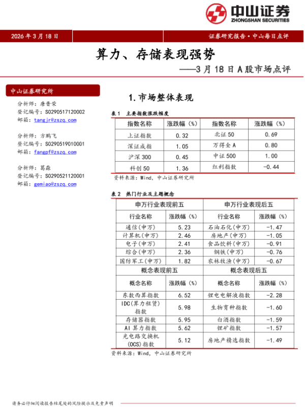 【中山证券】【202603】算力、存储表现强势——3月18日 A股市场点评-6页 证券期货研究报告