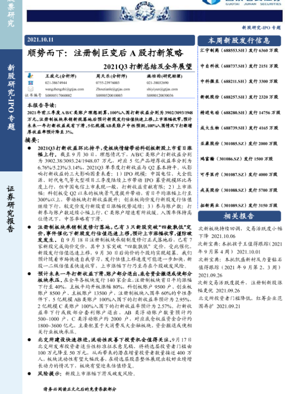 【国泰君安证券】【20211011】2021Q3打新总结及全年展望:顺势而下,注册制巨变后A股打新策略-25页 行业研究
