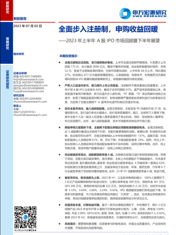 【申万宏源】【20230702】2023年上半年A股IPO市场回顾暨下半年展望:全面步入注册制,申购收益回暖-48页 行业研究
