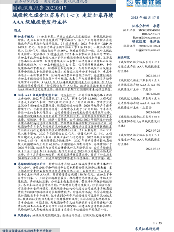 【东吴证券】【20230817】城投挖之掘金江苏系列(七):走进如皋存续AAA级城投债发行主体-25页 行业研究