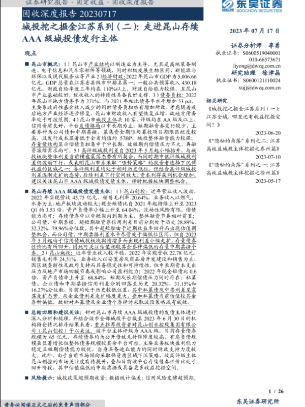 【东吴证券】【20230717】城投挖之掘金江苏系列(二):走进昆山存续AAA级城投债发行主体-26页 行业研究