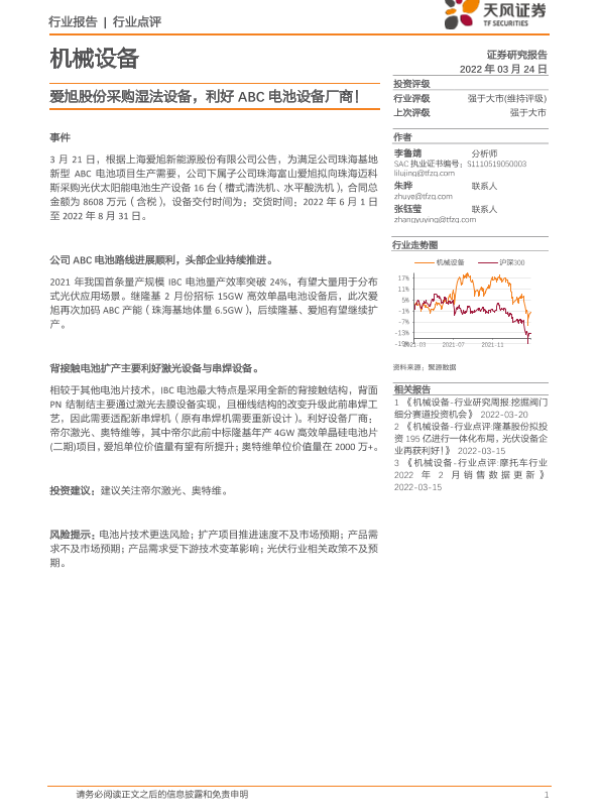 【天风证券】【20220324】机械设备行业点评:爱旭股份采购湿法设备,利好ABC电池设备厂商!-2页 行业研究