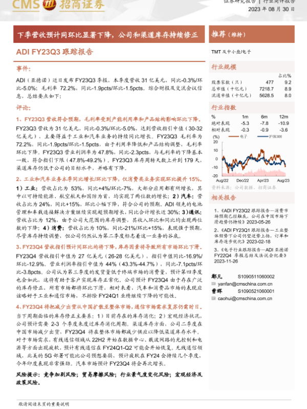 【海通证券】【20230830】20230830-招商证券-电子行业ADI FY23Q3跟踪报告:下季营收预计同环比显著下降,公司和渠道库存持续修正-11页 行业研究