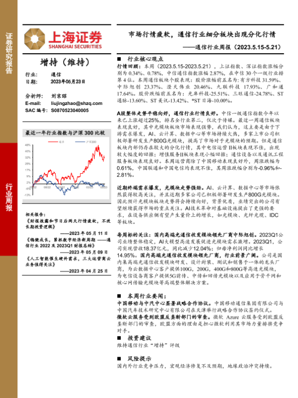 【上海证券】【20230523】市场行情疲软,通信行业细分板块出现分化行情-12页 行业研究