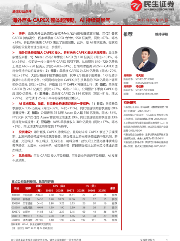 【民生证券】【20250805】通信行业点评:海外巨头CAPEX整体超预期,AI持续高景气-2页 行业研究