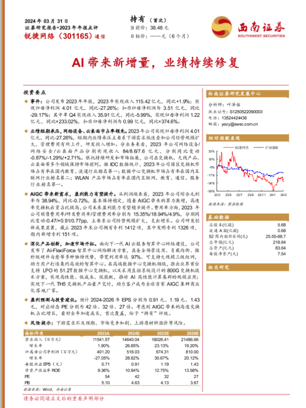 【西南证券】【20240331】锐捷网络-301165.SZ-AI带来新增量,业绩持续修复-15页 行业研究