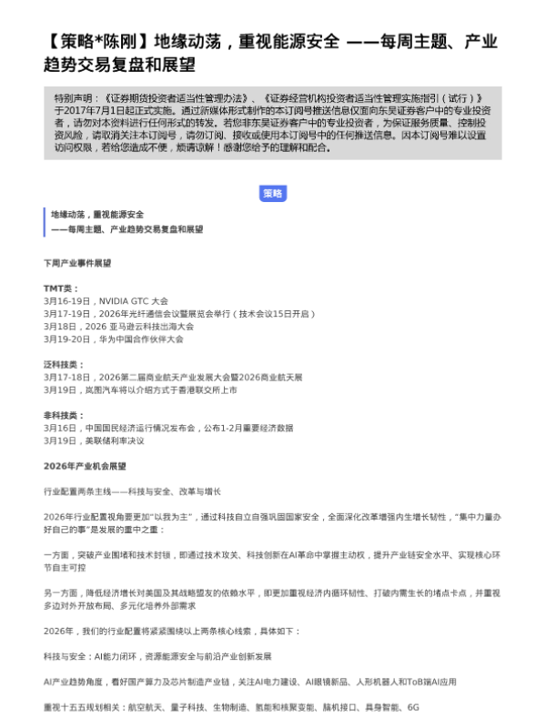 【东吴证券】【202603】地缘动荡,重视能源安全——每周主题、产业趋势交易复盘和展望-4页 证券期货研究报告