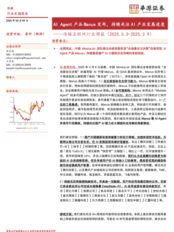 【华源证券】【20250309】20250309-华源证券-传媒互联网行业周报:AI Agent产品Manus发布,持续关注AI产业发展进度-17页 行业研究