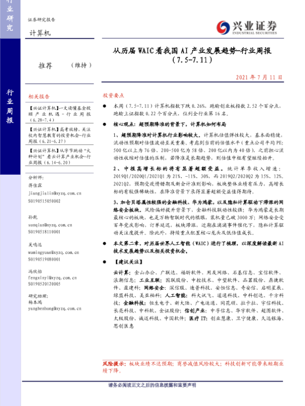 【兴业证券】【20210711】从历届WAIC看我国AI产业发展趋势-行业周报 (7.5-7.11)-24页 行业研究